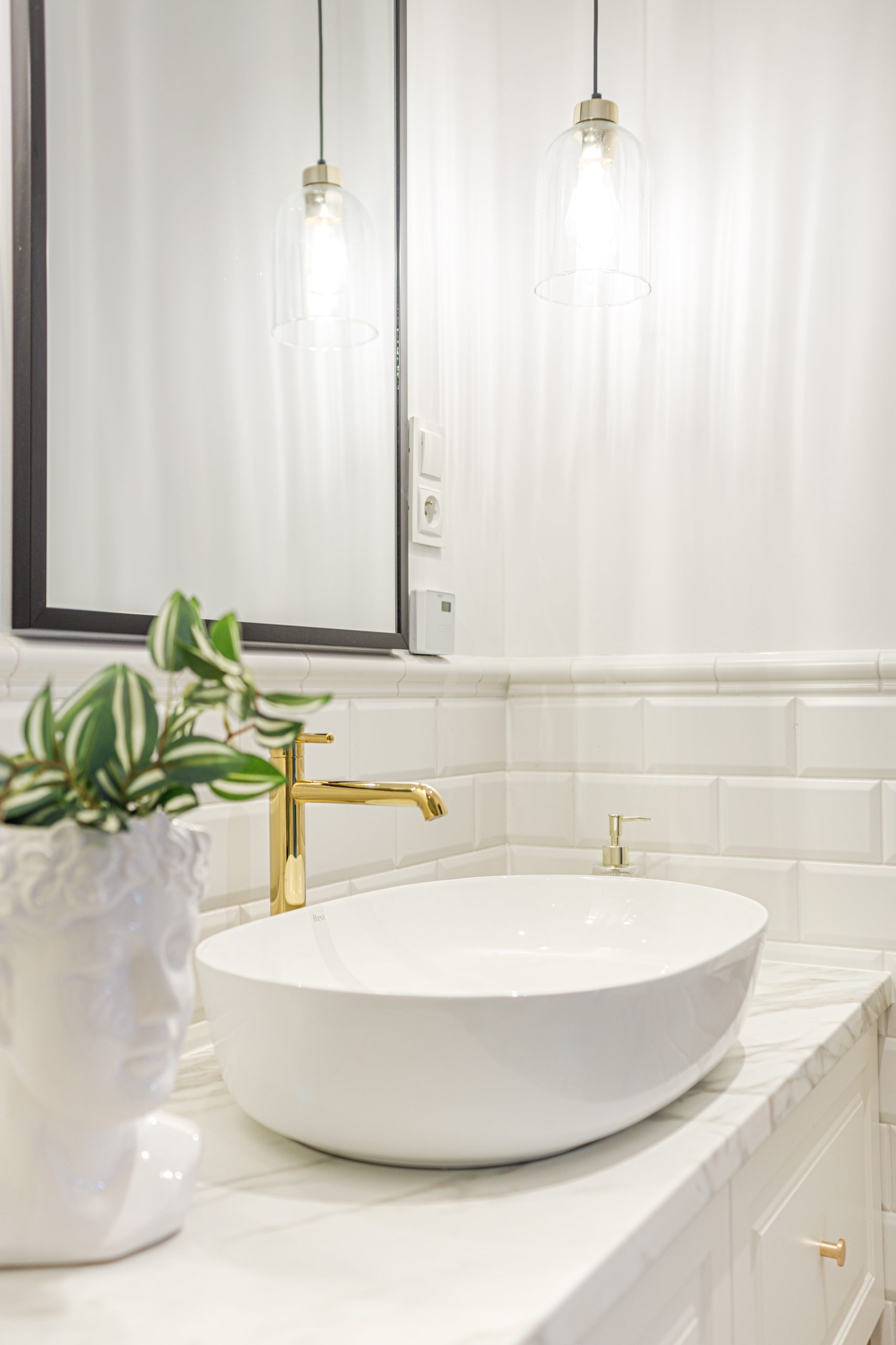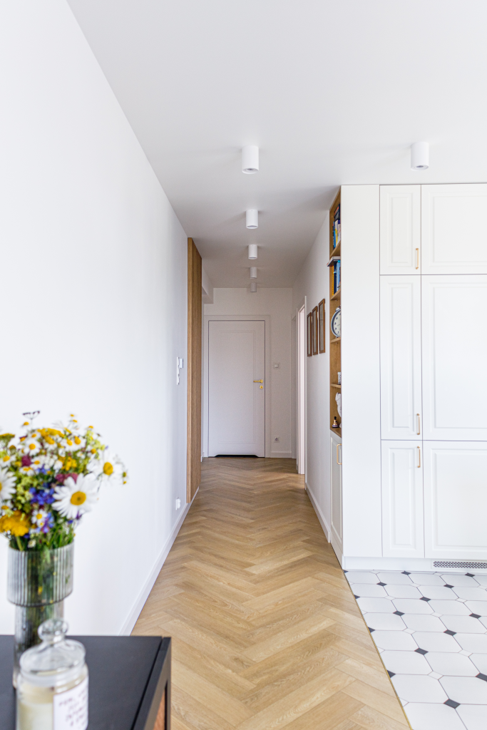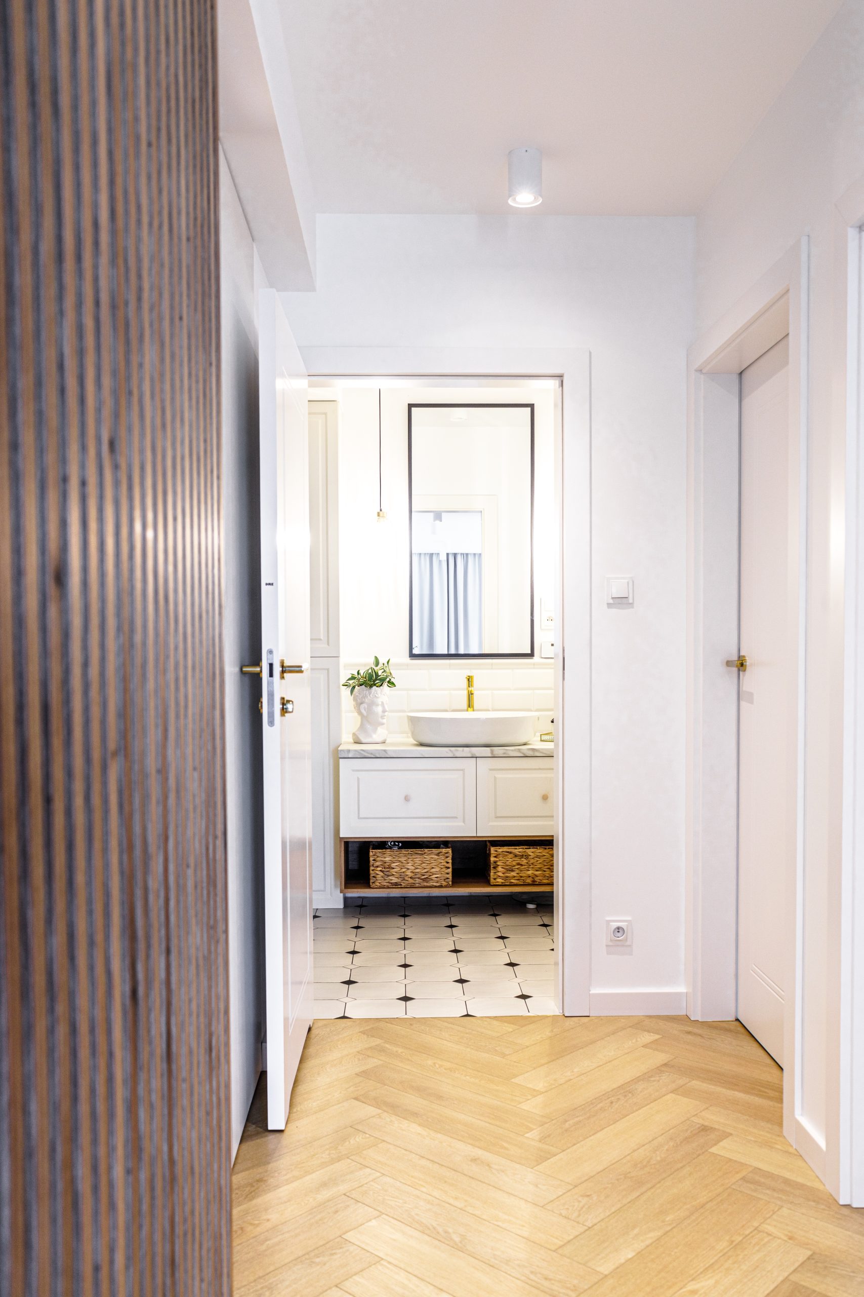 Projekt utrzymany w jasnej, harmonijnej tonacji łączy nowoczesną klasykę z naturalnym ciepłem drewna. Subtelne marmurowe akcenty i złote detale dodają elegancji, a przemyślana zabudowa i oświetlenie zapewniają funkcjonalność i spójność całej przestrzeni. To wnętrze pełne światła, spokoju i ponadczasowego stylu.